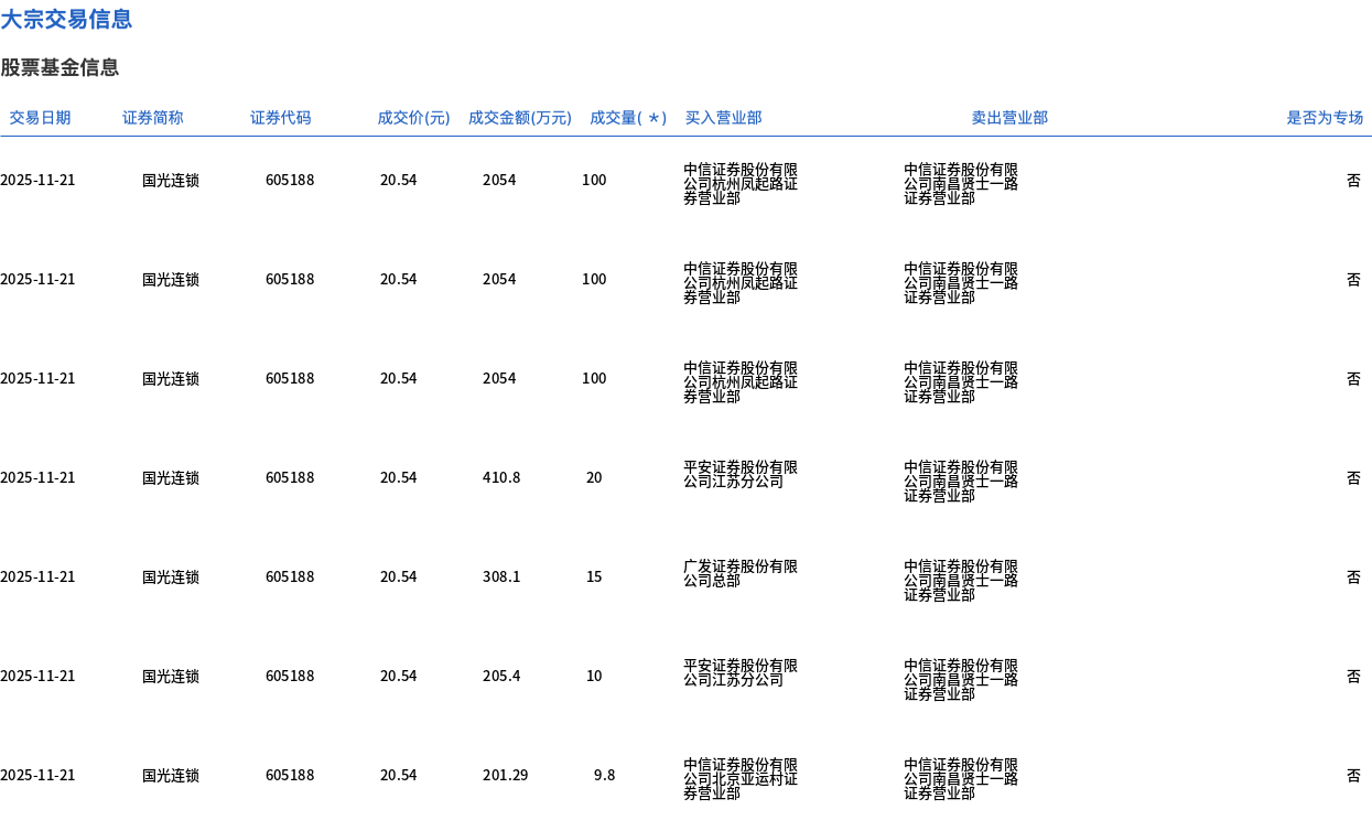 11月21日,国光连锁大宗交易成交354.8万股,成交额7287.59万元,占当日总成交额的8.96%,成交价20.54元,较市场收盘价23.65元折价13.15%。